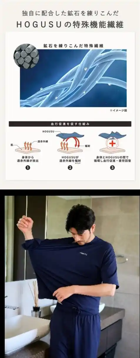 HOGUSUのリカバリーウエアは、疲労回復をサポートする一般医療機器です。独自に開発した機能糸を織り込み、着ることで血行促進・疲労回復をサポートします。リモートワークや寝起き、家でのくつろぎ時間に、頑張らずとも着ているだけで血行促進・疲労回復のサポートを実現します。 |