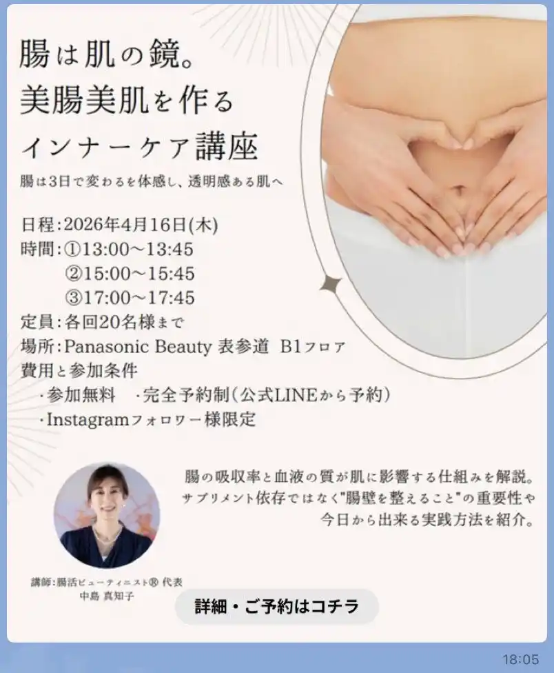 腸活ビューティニスト代表の中島真知子様を講師にお迎えし、腸の吸収率と血液の質が肌に影響する仕組みを解説。サプリメント依存ではなく「腸壁を整えること」の実践方法をご紹介いたします。 |