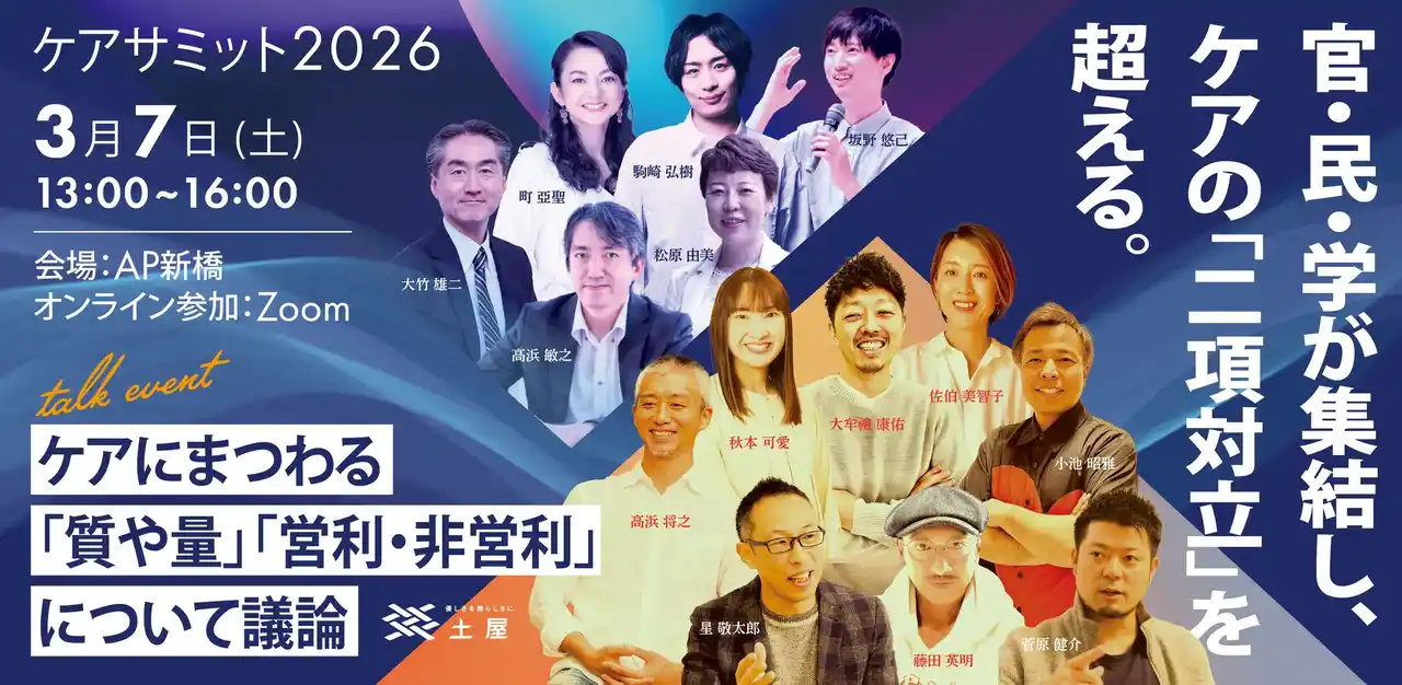 | 介護のトータルケアカンパニーとして全国47都道府県で障害をお持ちの方や高齢者に介護サービスを提供する株式会社土屋(本社:岡山県井原市、代表取締役:高浜敏之)は、2026年3月7日(土)、『ケアサミット2026―立場を超え“利用者のための共創”を実現するには ―』を開催しました。このたびイベントの反響を受け、イベントレポートを公開いたします。 | ||||||||||||||||||||