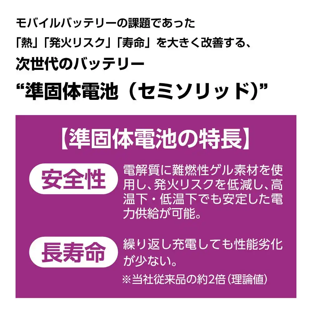 ●次世代電池「準固体電池」を採用 高い安全性と安定した性能を実現 本シリーズには、電解質の一部に固体材料を用いた準固体電池を採用。 従来の液系リチウムイオン電池と比較し、安全性・耐久性の向上が期待されます。 日常的に持ち運ぶモバイルバッテリーとして、安心感を重視した設計です。 これにより、スマートフォンやタブレットなどの充電を、より安全かつ安定して行うことが可能です。 |