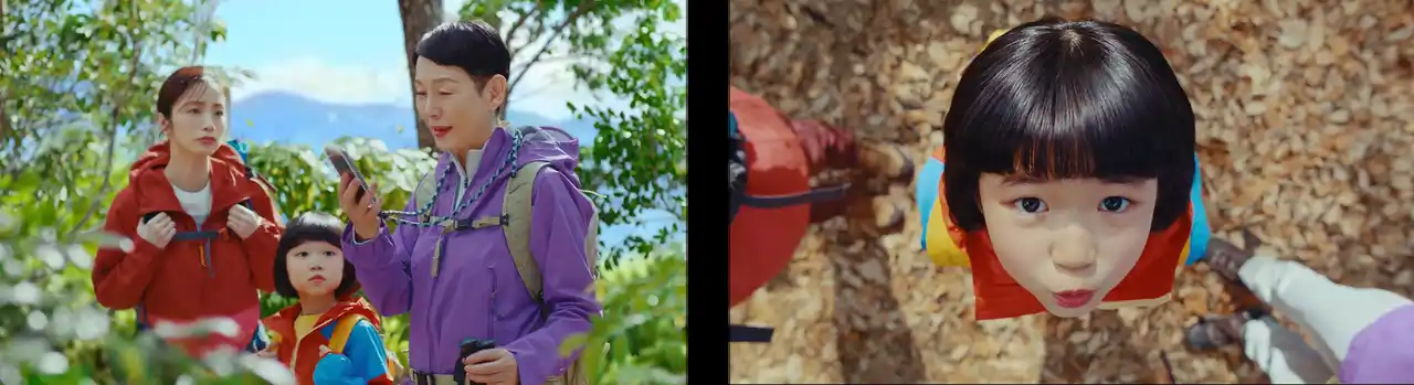 | 山奥を散策中のアヤ(上戸さん)とお母さん(樋口さん)とゆの(永尾さん)。「あ! 今日お兄ちゃんの誕生日だ」というアヤの言葉に、お母さんが「忘れてたわ」と返すと、ゆのが「お祝いメールしてあげようよ」と提案。「でも、こんなに山奥だと圏外だから」とスマホを見るお母さん。すると、「俺がつなぐぞー!」というお父さんの声が聞こえ、それに気付いた3人が「お父さん?」と空を見上げると、はるか上空の宇宙で、お父さんが「圏外でも!」とアピール。「送ってみようよ」というゆのの言葉を受けて、さっそくアヤがメッセージを送ると、お父さんが「空が見えたら日本中つなぐぞ」と受け取ったメッセージを飛ばして、海の上で船釣り中の兄に「お誕生日おめでとう!」というメッセージを届けます。「あ、届いた!」と兄。「良かったなー!!」とコクピットで叫ぶお父さんの姿が映ります。 | |||