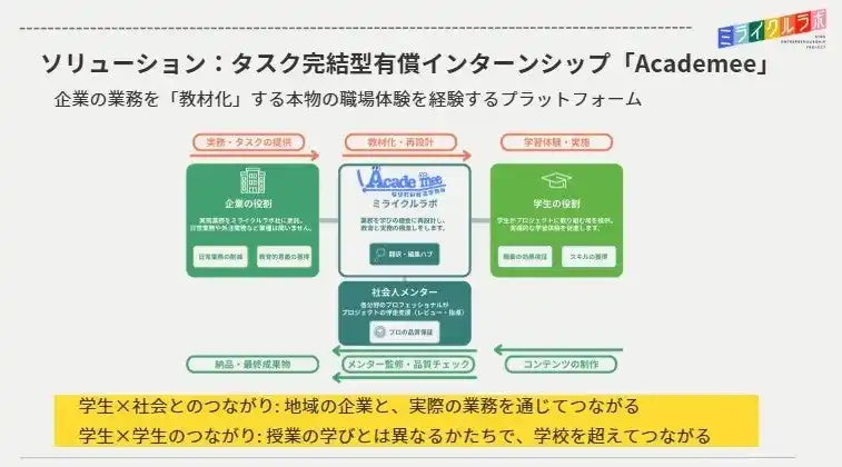 ミライクルラボが展開する「Academee」は、企業のリアルな業務を学生の「教材」に再設計し、成果物を「納品」するまでを学びに転換する独自のプログラムです。これにより、企業の課題解決と学生の成長を同時に実現する“教育×事業“モデルを構築します。 本事業においては、北九州の事業者・関係者と連携し、産業界・教育・地域をつなぐ実践的な学びの場を展開します。 |