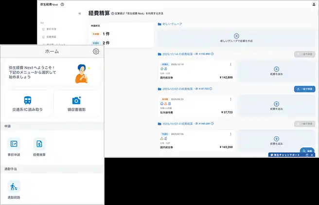 これまで、「弥生経費 Next」は法人向けクラウドサービス「弥生会計 Next」 とあわせて提供してきました。「弥生経費 Next」は、AIを活用した入力補助やチェック機能、電子帳簿保存法への対応など、経費精算業務に必要な機能を網羅的に備えながら、初期費用0円、従業員1人あたり月額700円から利用できる料金設計により、高いコストパフォーマンスを実現したクラウド経費精算ソフトです。