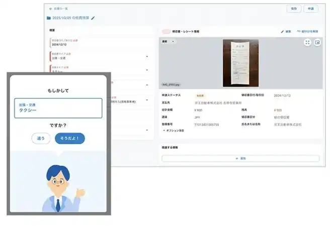 領収書・レシートをアップロードすれば、AIが画像を読み取り、適切な取引先名や一部の科目名を提案します。また、領収書・レシートはまとめてアップロード※1が可能です。これにより、月末の申請のために大量のデータを入力する必要がなく、入力漏れや誤りを未然に防ぐことができるので、申請者と承認者の双方の負担が軽減されます。 |