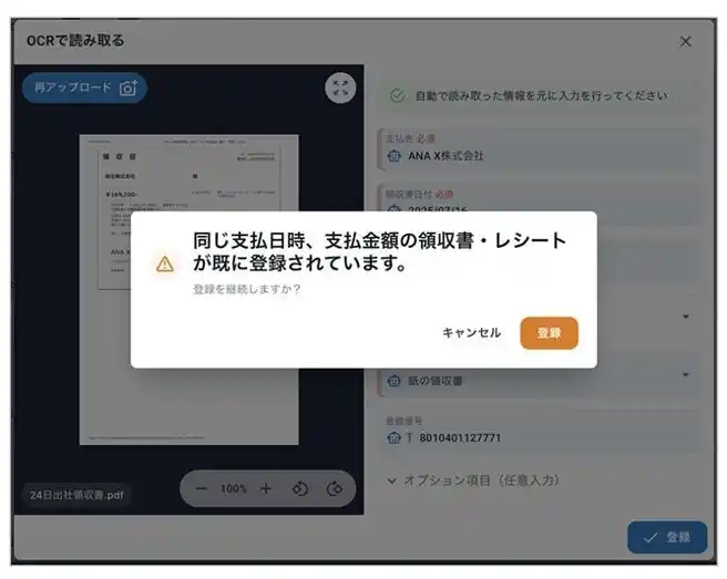 重複した領収書をアップロードした場合、自動でAIが検知してアラートを出します。 |