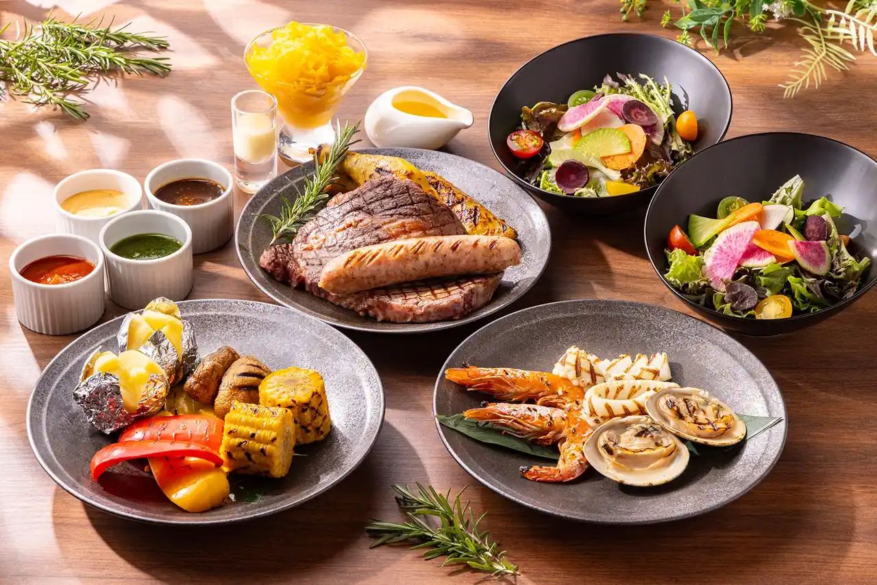 黒毛和牛サーロイン 100g / オーストラリア産ビーフ リブアイ 50g / ポークスペアリブ / ビッグソーセージ / オマール海老テール 1/2 / シーフードプラッター (有頭海老、イカ、ハマグリ) / シェフ特製豚バラ肉のチーズタッカルビ風 / 焼き野菜 / ミックスグリーンサラダ / マンゴーシェーブアイス |