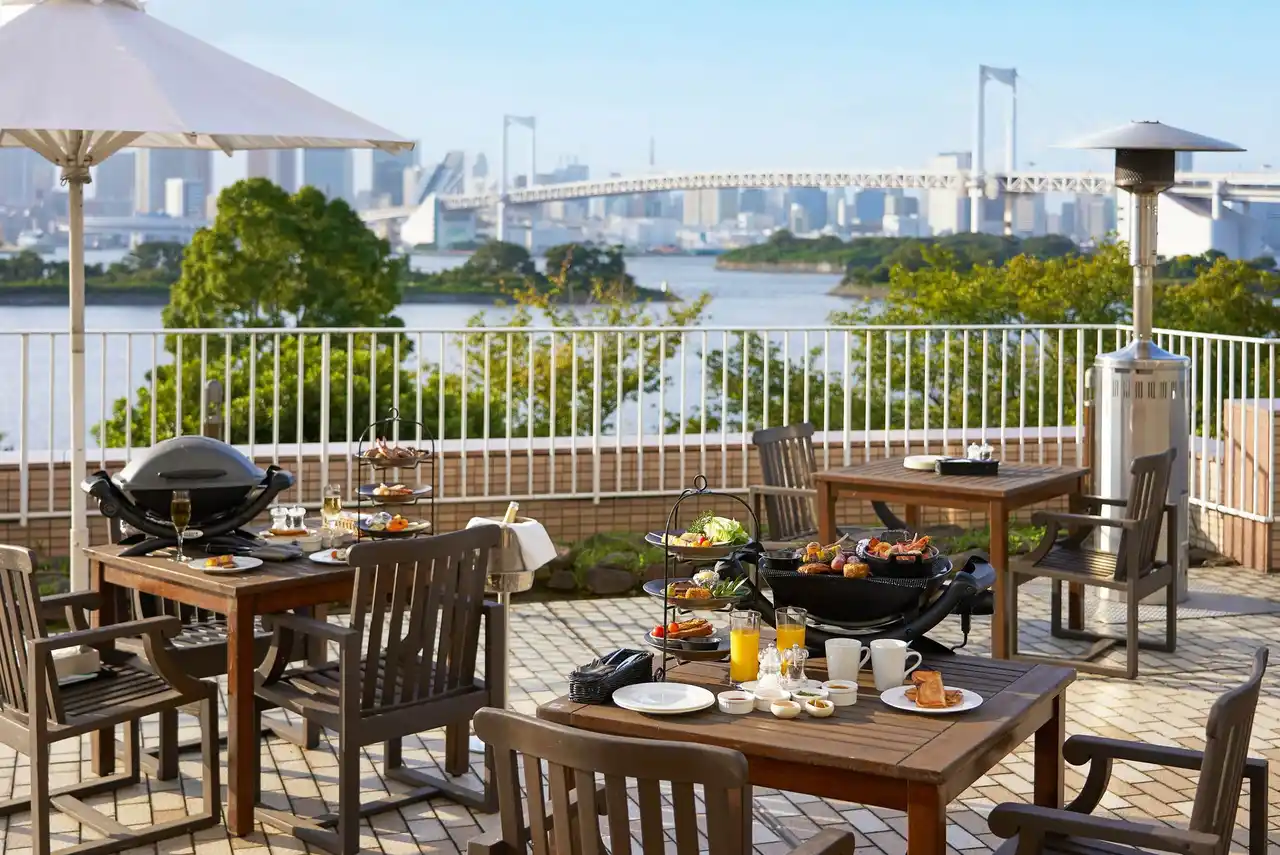 ヒルトン東京お台場2階のテラスエリアに位置する「アブレイズ」は、レインボーブリッジや東京タワーなど、東京湾のパノラマビューが眼前に広がる絶好のロケーションが特長です。刻々と表情を変える空と潮風に包まれながら、開放感あふれるアウトドアダイニングをお楽しみいただけます。 |