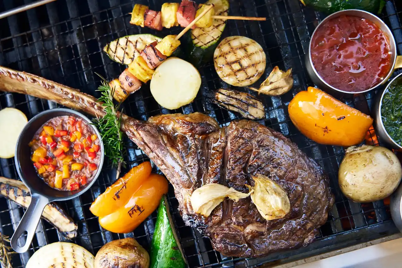 オーストラリア産ビーフ リブアイ 150g / 骨付き鶏モモ肉のタンドリースパイス / ビッグソーセージ /シーフードプラッター(有頭海老、イカ、 ハマグリ)/ 焼き野菜 / ミックスグリーンサラダ / マンゴーシェーブアイス |