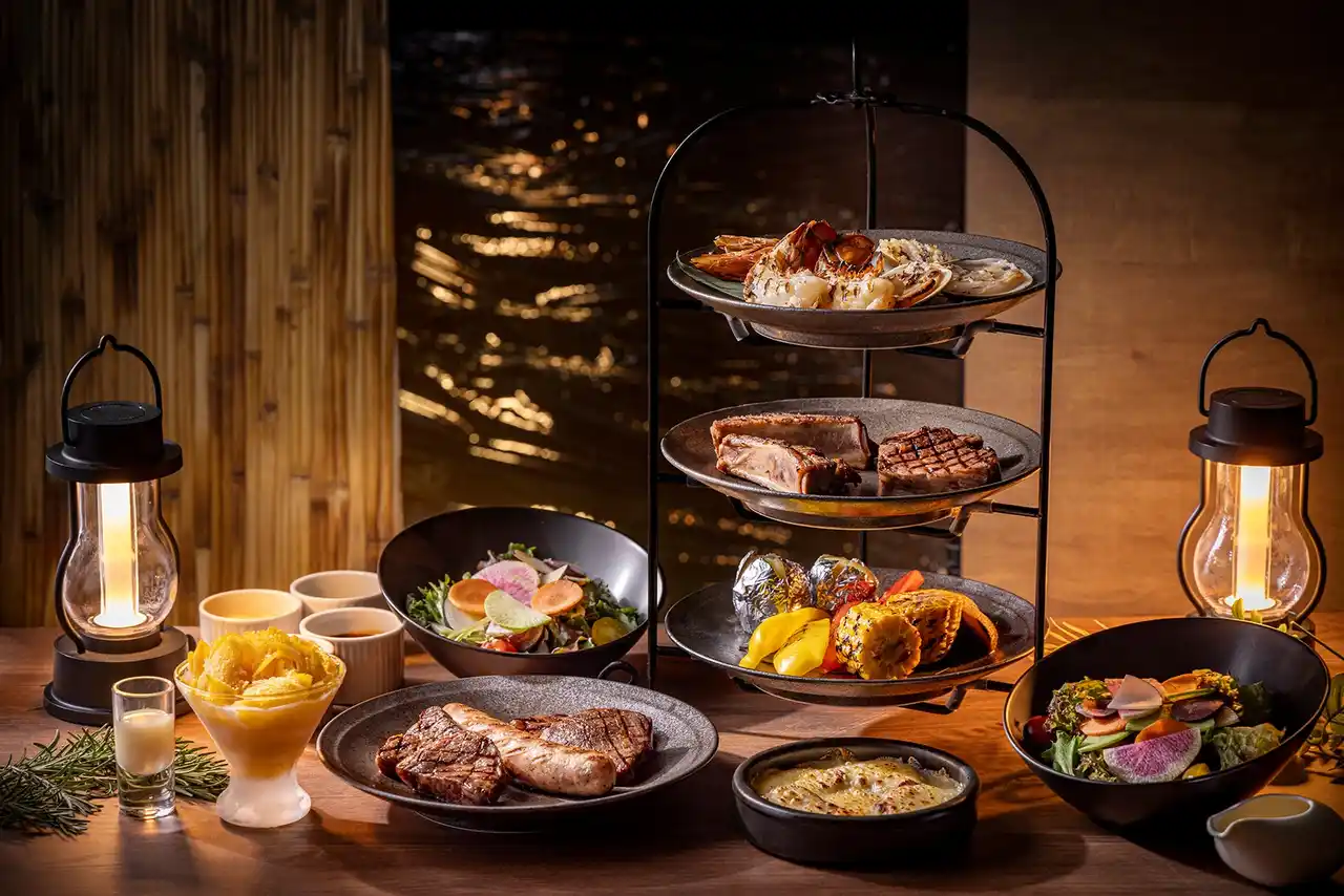 さらに、セットメニューに追加できるアラカルトも充実。凝縮された旨みと弾力を味わう「活鮑のグリル」をはじめ、「ロブスターテール」や「北海道産ホタテ貝柱」などのシーフード、「ラムチョップ」などの肉料理を取り揃え、より食べ応えのあるバーベキューをお楽しみいただけます。 |