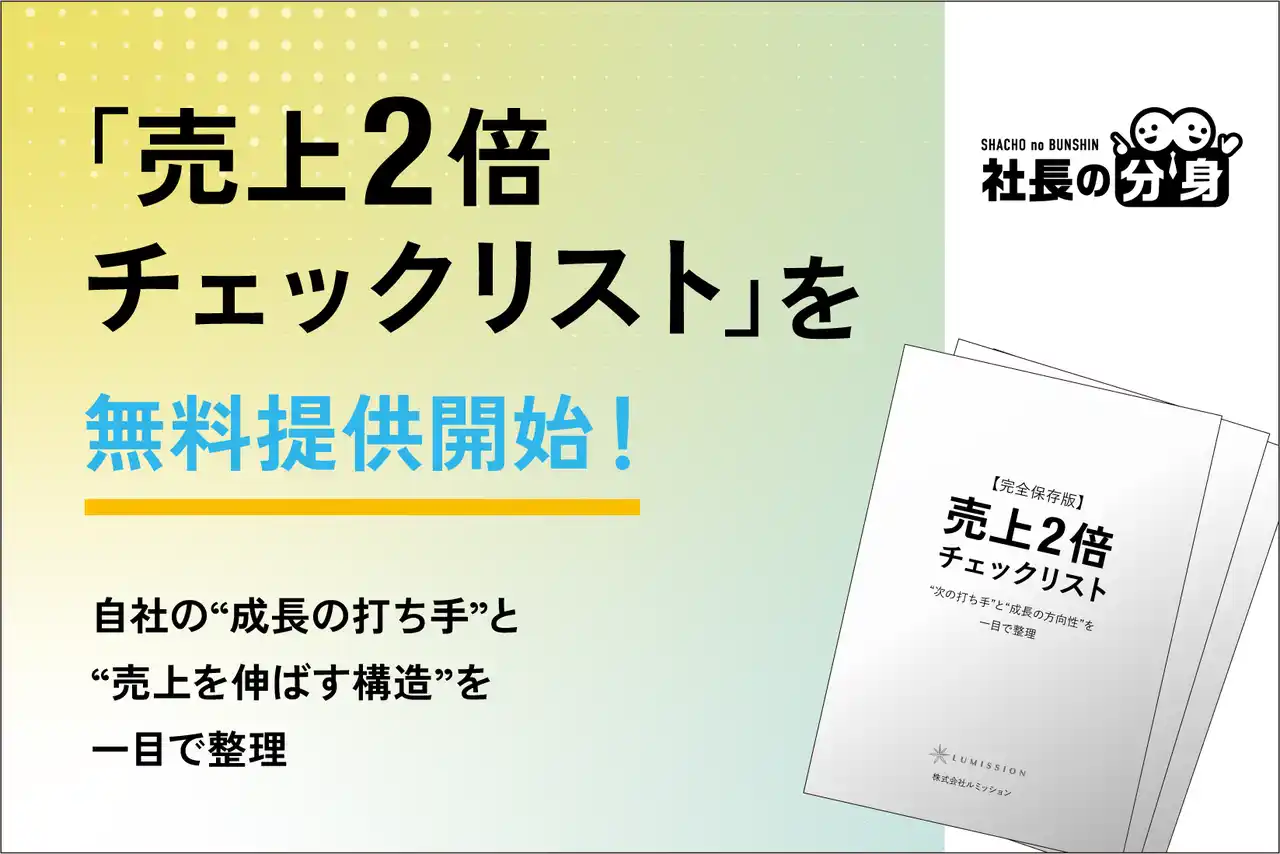 1.「社長の分身」無料登録(30秒) 2.経営個別相談(無料) 3.売上2倍チェックリストをダウンロード |
