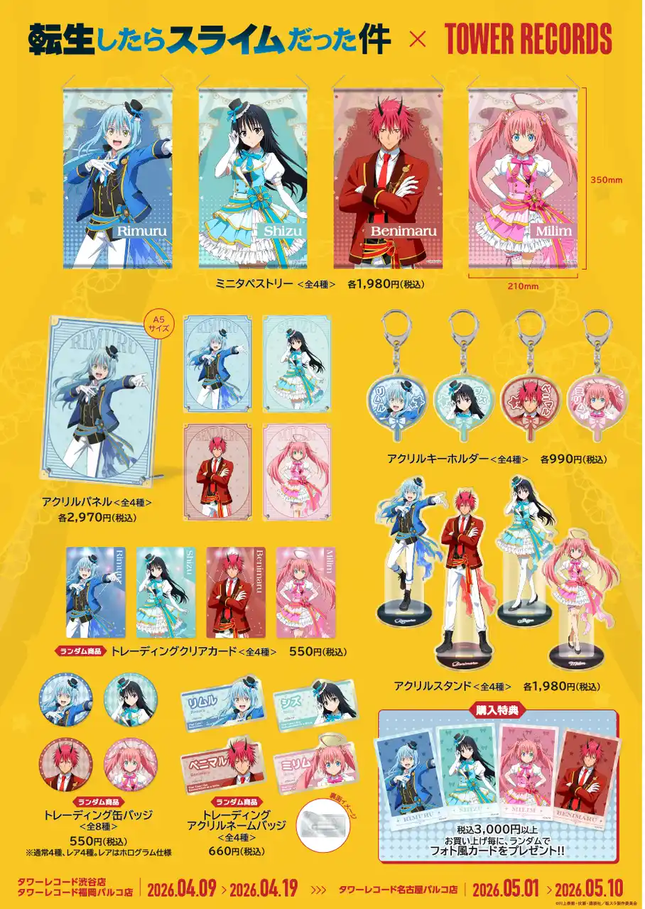 | 2026年4月9日(木)から、タワーレコード渋谷店・福岡パルコ店、5月1日(金)から名古屋パルコ店にてTVアニメ『転生したらスライムだった件』 POP UP SHOP in TOWER RECORDSの開催が決定しました! | |||