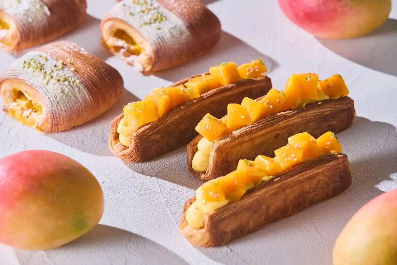 1階ロビーに隣接するベーカリーショップ「ファリーヌ」では、ペストリーや焼きたてパン、ケーキなどをテイクアウトドリンクと共に気軽にお楽しみいただけます。この初夏限定で、エグゼクティブペストリーシェフ、ハーフィス・ラザリが手がける、マンゴーやレモンなどのフルーツの瑞々しさと、チョコレートやキャラメルのリッチな風味が調和した、個性豊かなコレクションをご用意しています。 |