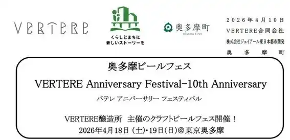 クラフトビールブルワリーVERTERE(バテレ・奥多摩町)は2026年2月で、醸造開始から10周年を迎えました。この節目を記念して、奥多摩の醸造所敷地にて「VERTERE Anniversary Festival」を開催いたします。 |