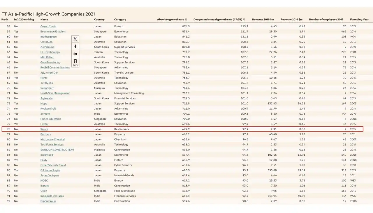 | (株)三味の歩みは、客観的なデータによってその卓越性が証明されています。2021年4月、英Financial Times、日経アジア、独Statistaが共同で世界100万社以上の企業の中から選定する「High-Growth Companies Asia-Pacific 2021(アジア太平洋地域の急成長企業ランキング)」において、全業種・全業態の中で第78位にランクイン。さらに特筆すべきは、レストラン業を含む食品業界全体でアジア1位という快挙を成し遂げた点にあります。 | |||||||||||||||||||