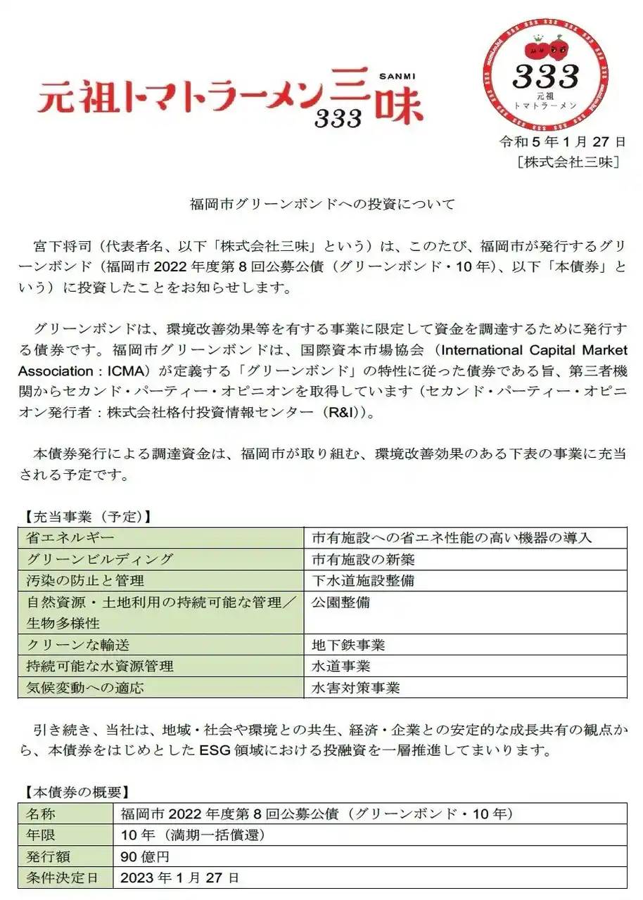 | 株式会社三味 福岡市2022年度第8回公募公債(グリーンボンド)投資表明ページ | |||||||||||||||||||