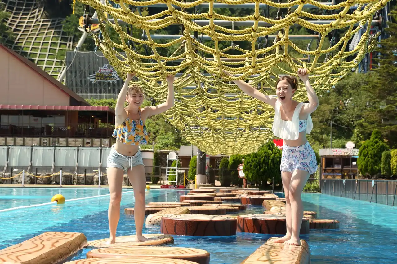 【スーパーモンキーフロート】バランス感覚と身軽さに自信のある人はここに集合!バランス感覚が試される!?プールを横断する浮島の群れをプールに落ちないように渡り切れるか!? |