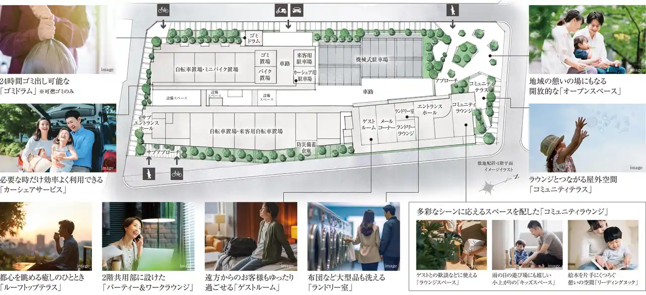 ※掲載の敷地配置・1 階平面イメージイラストは計画段階の設計図書を基に描いた概念図です。植栽・形状等は施工上の都合、行政官庁の指導等により変更が生じる場合があります。 |