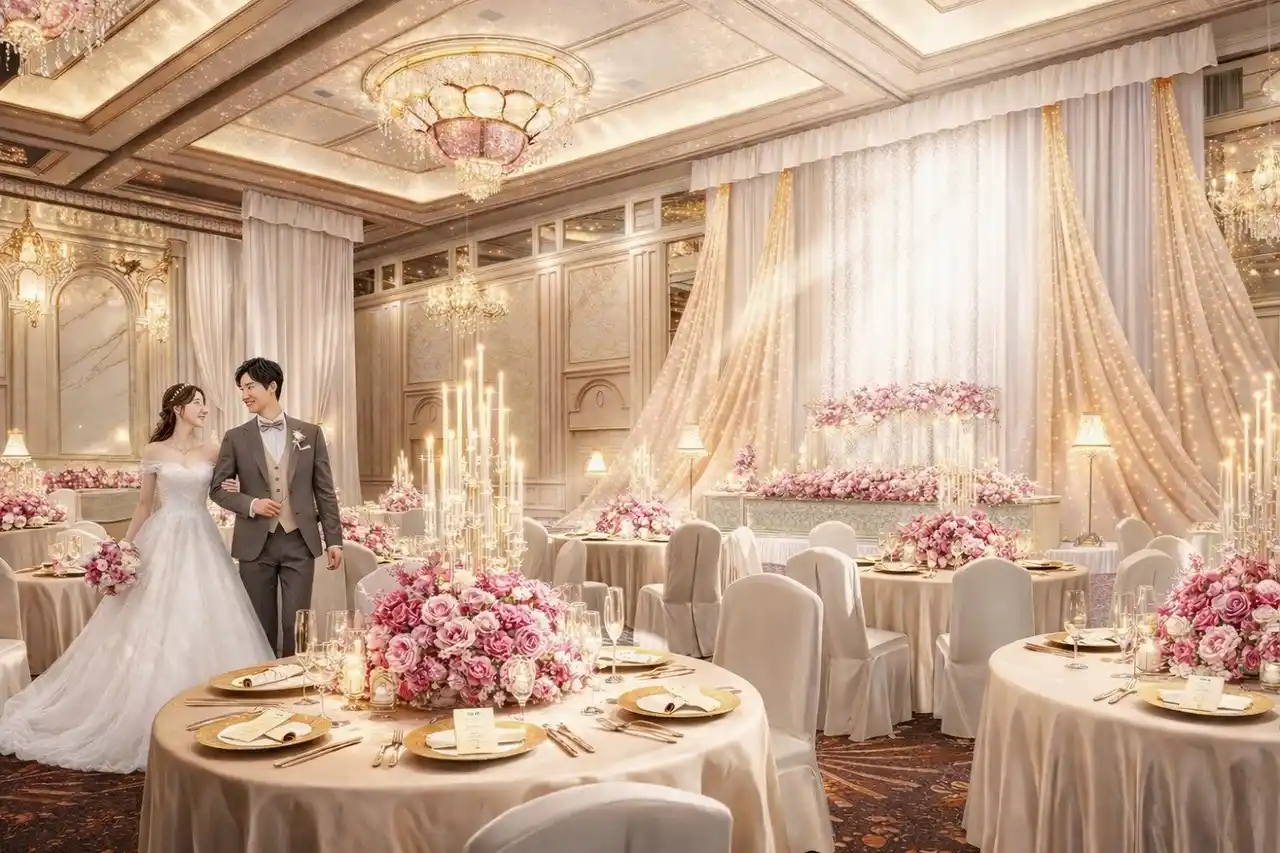 さらに、刺繍レースのドレープやオーガンジーのシアー素材、LEDイルミネーションを組み合わせることで、クラシカルな美しさと現代的な輝きを調和。柔らかな光に包まれる空間が、まるでドレスアップするかのような高揚感を生み出し、ゲストの期待感を自然と高めます。 |