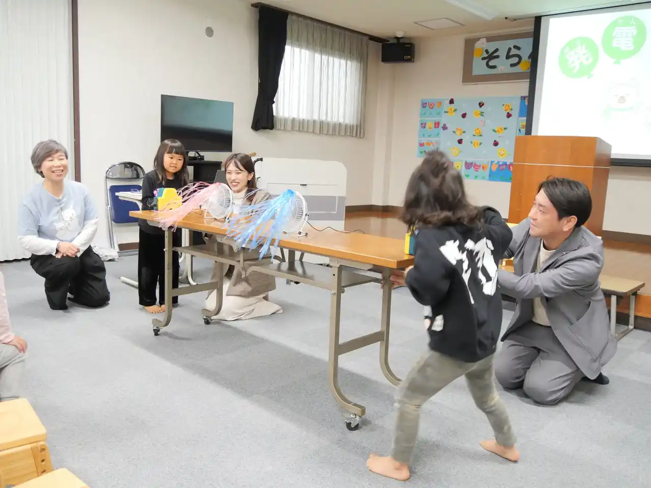 参加した園児たちは「大変だった!」「少し疲れたけど、楽しかった!」といった声を上げ、楽しみながら電気の仕組みを体感しました。 |