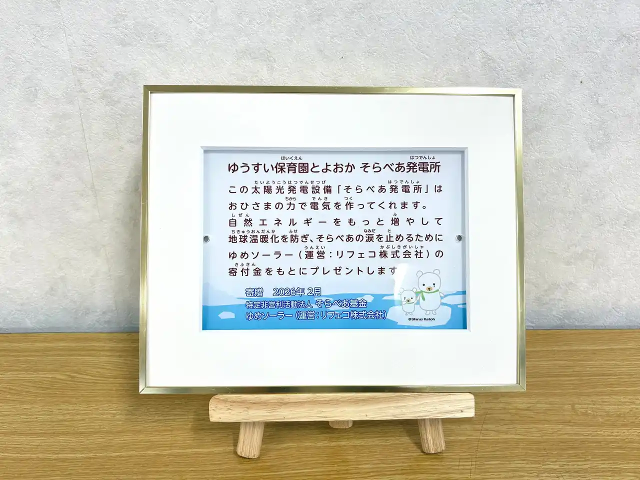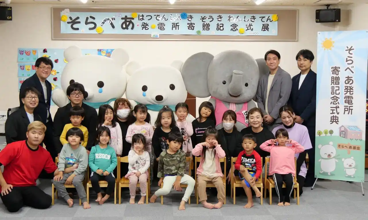 九州地区でゆめソーラーを展開するリフェコ株式会社(本社:福岡県福岡市、代表取締役社長:山森 卓夫)はこの度、特定非営利活動法人そらべあ基金(所在地:東京都港区、代表理事:冨田 秀実、以下「そらべあ基金」)が行う「ご当地版 そらべあスマイルプロジェクト」に協賛し、ヴェゼルワークス株式会社 ゆうすい保育園とよおか(代表:枝元 宏輔、以下「ゆうすい保育園とよおか」)へ太陽光発電設備「そらべあ発電所」を寄贈しました。 |