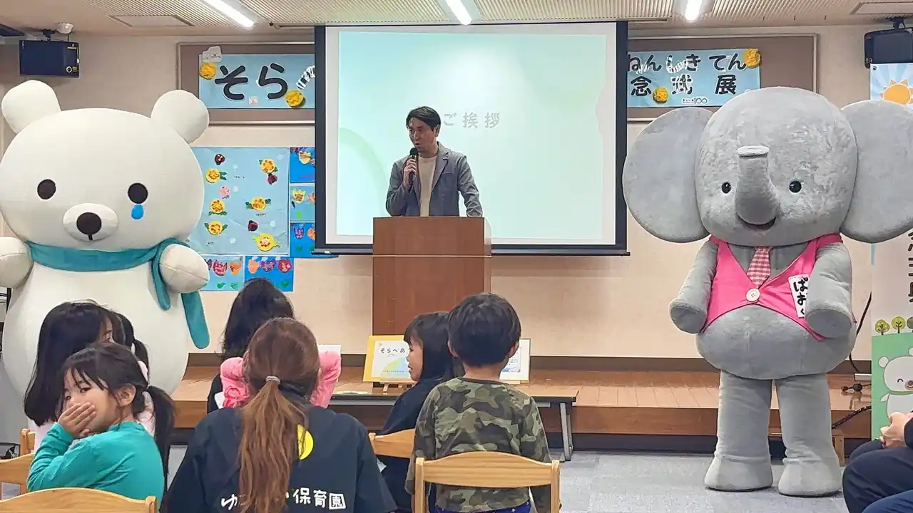そらべあ基金のキャラクターであるホッキョクグマ兄弟の「そら」「べあ」と、ゆめソーラーのマスコットキャラクター「パオくん」が登場すると、会場は一気に和やかな雰囲気に包まれ、園児たちの笑顔と歓声が広がりました。 |