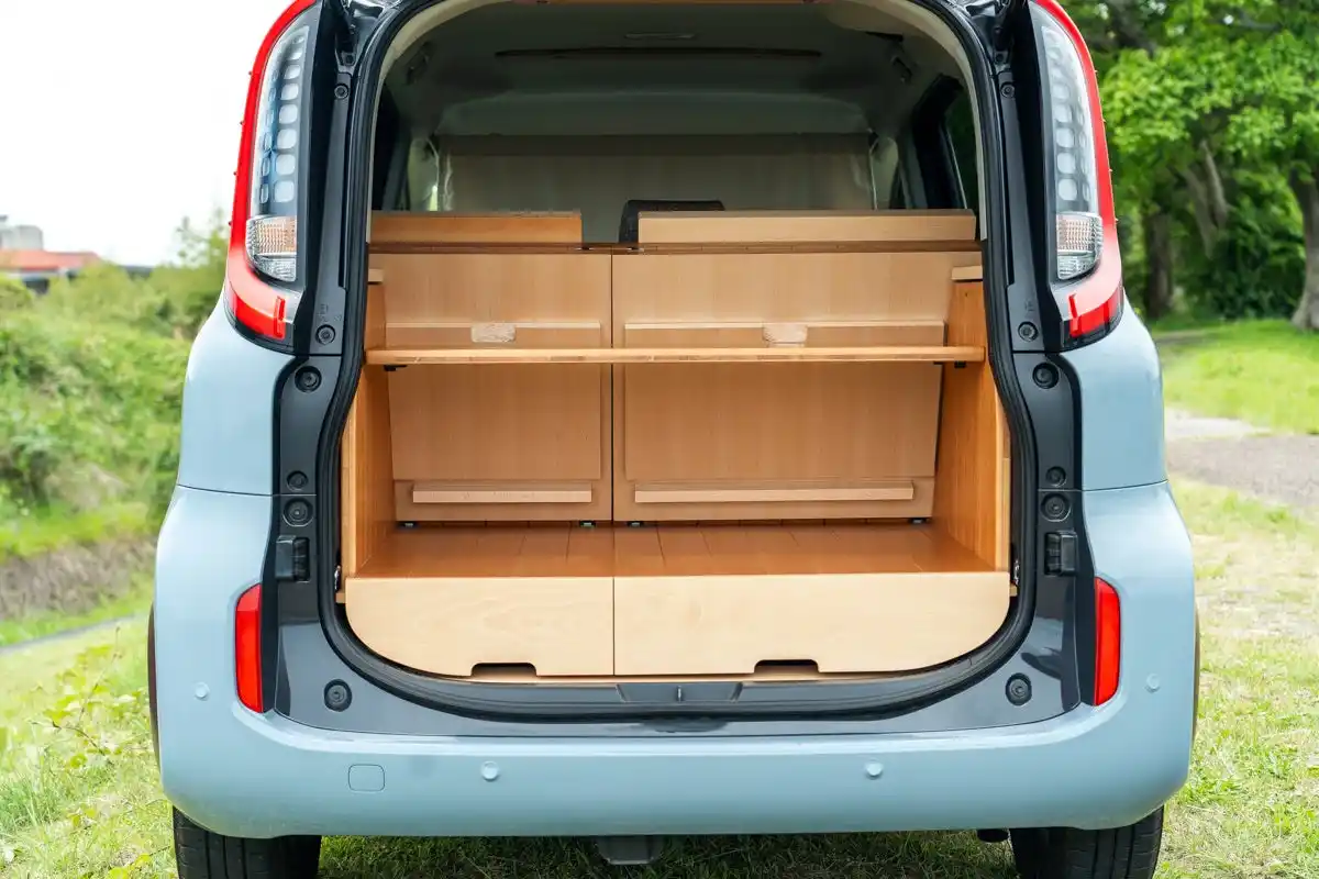 トヨタ シエンタが部屋になるルームキット。走行時は通常の5人乗り、くつろぐ時は大人2人がゆったりくつろげる部屋へとシームレスに切り替えができます。室内、室外で使えるテーブル付きです。2025年11月に特許取得済み(特許第7768517号)。 |