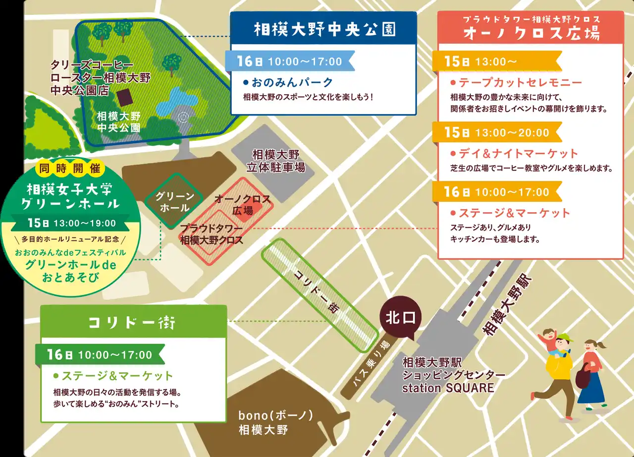 本イベントは、「相模大野のみんな=通称『おのみん』」が主役となり、まちの魅力と可能性を再発見する回遊型イベントです。プラウドタワー相模大野クロス オーノクロス広場・コリドー街・相模大野中央公園・相模女子大学グリーンホールとその周辺を舞台に、人と活動がつながる特別な2日間を創出します。 |