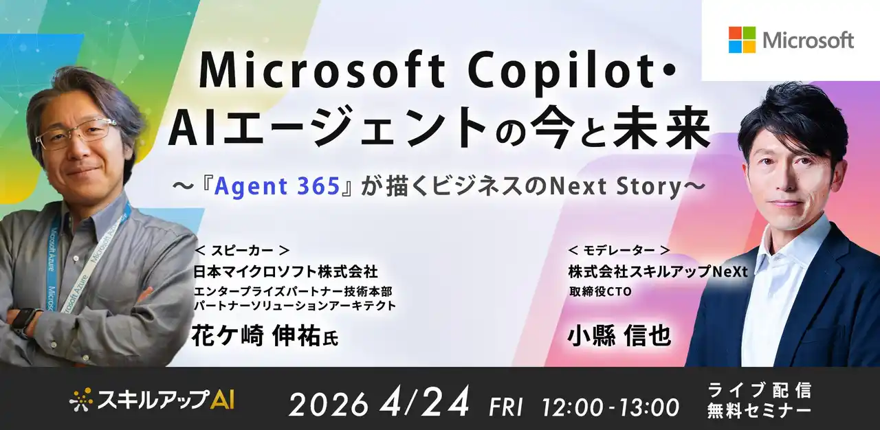 | マイクロソフトの最上位パートナー資格「Microsoft Copilot」 Specialization取得企業である株式会社スキルアップNeXt(本社:東京都千代田区、代表取締役:田原 眞一、以下「スキルアップNeXt」)は、日本マイクロソフト株式会社(本社:東京都港区、代表取締役社長:津坂 美樹、以下「日本マイクロソフト」)のパートナーソリューションアーキテクトとして国内企業のAIソリューション設計・実装を支援する花ケ崎氏をゲストに迎え、セミナーを開催することをお知らせいたします。 | ||||||||||||||||||||||||||||||||