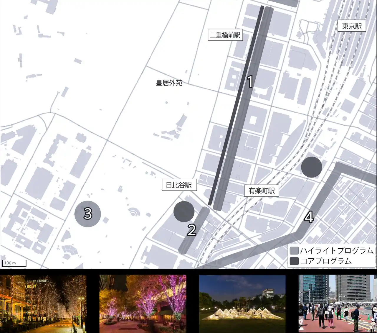 1.丸の内エリア・イルミネーション装飾※昨年の様子 2.日比谷マジックタイムイルミネーション 3.花と光のムーブメント(日比谷公園×アート) 4.KK線アートイベント(仮称) |