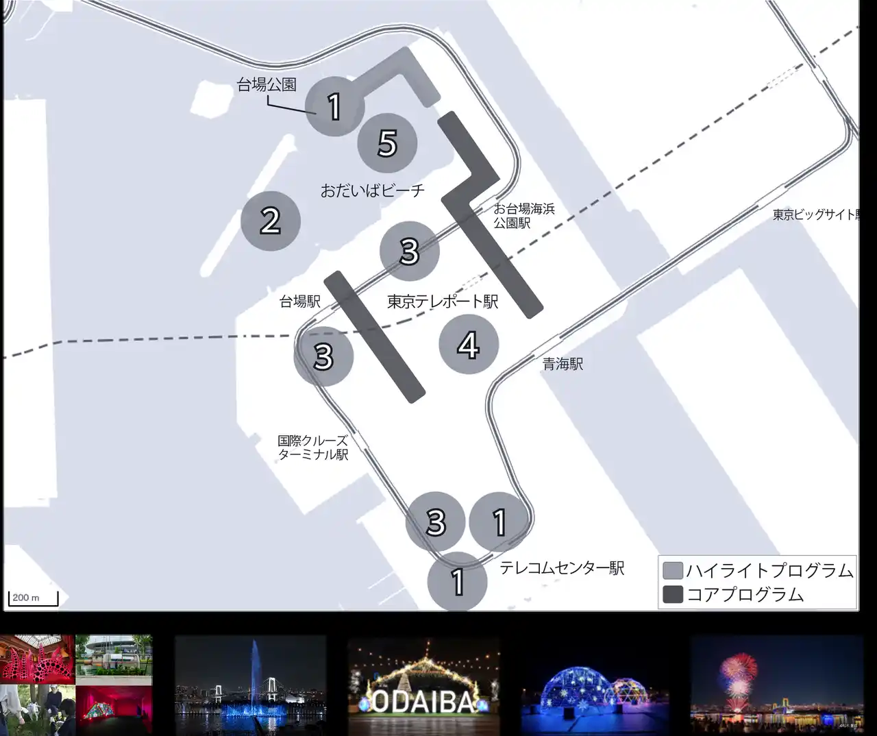 1.国際美術展 TOKYO ATLAS 2.東京アクアシンフォニー 3.イルミネーションアイランドお台場 4.臨海副都心イルミネーション※開催エリアは調整中(上記地図はイメージ) 5.お台場レインボー花火 |