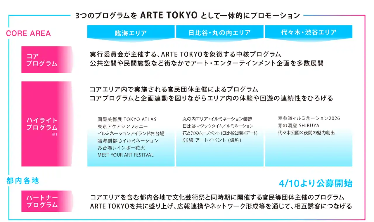 ARTE TOKYOでは、象徴的なイベントやベニューが集積する3つのコアエリアを中心に、パートナープログラム等との連携を通じて、多摩・島しょ地域を含む都内各地へと展開していきます。 |