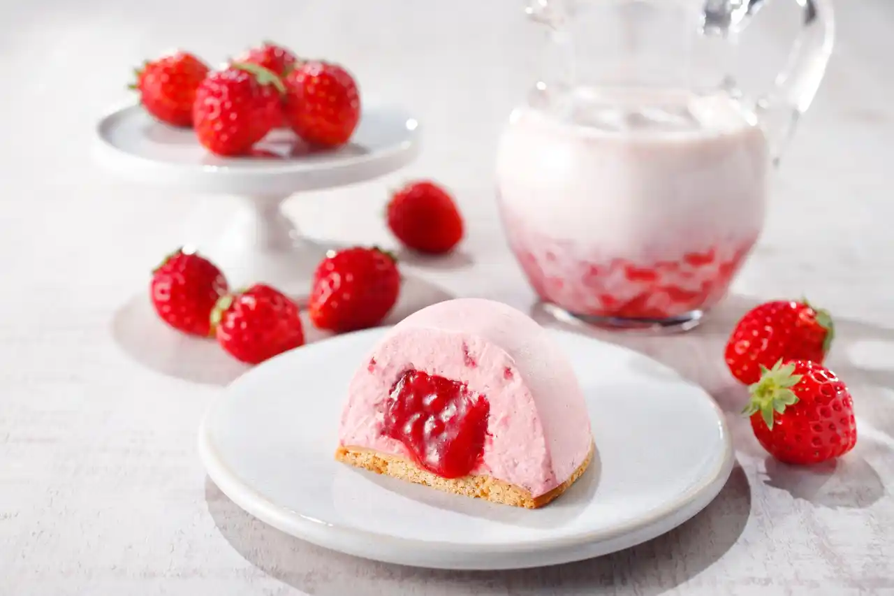 華やかなイチゴの色味に合わせて3種のベリーピューレで仕上げたジュレをイチゴピューレと生クリームで仕上げた優しいコクの広がるムースで包み込みました。イチゴの甘酸っぱさとミルクの口溶けが絶妙なマリアージュとなって口いっぱいに広がります。 |