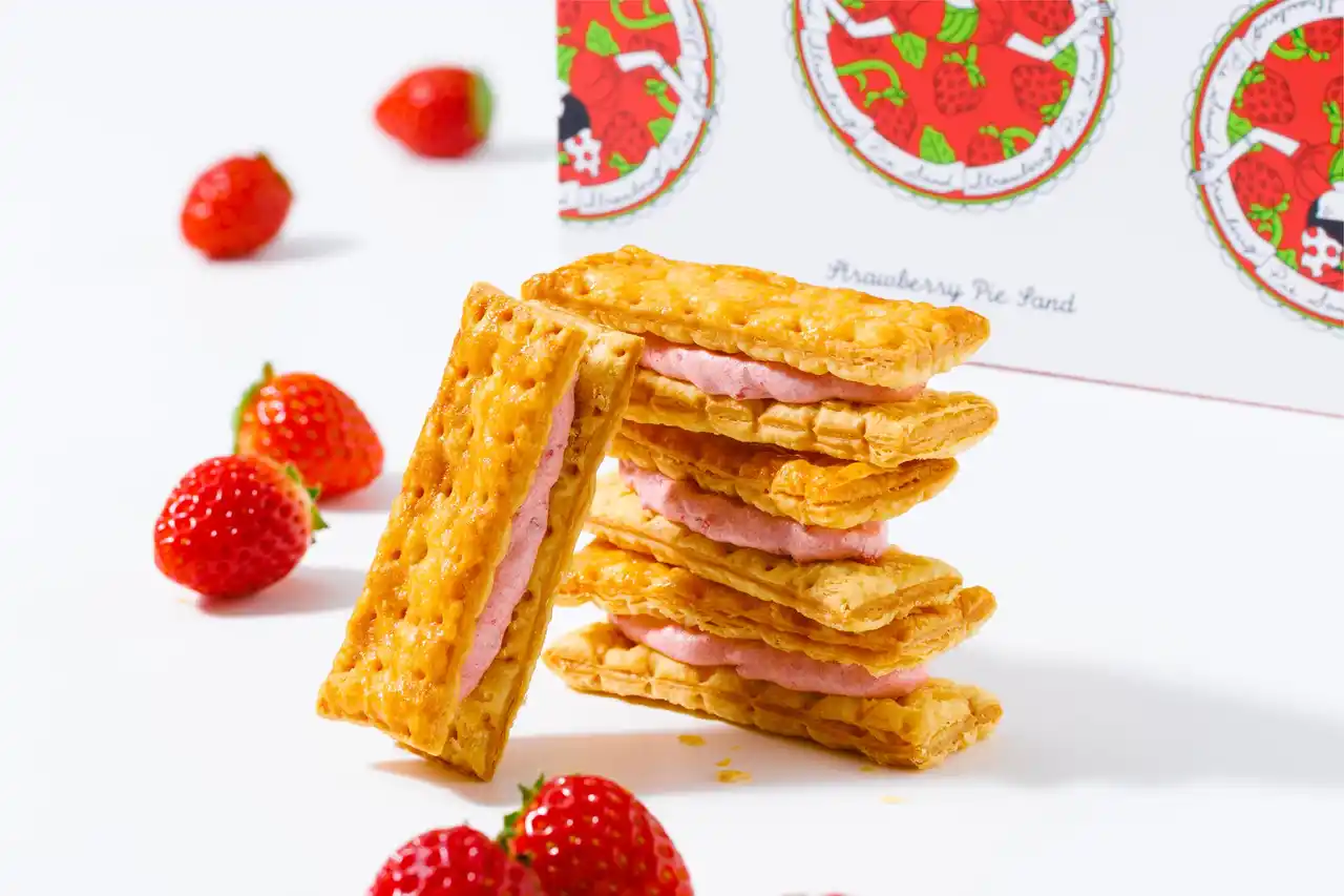 サクッと軽やかなパイ生地に、 甘酸っぱいイチゴの風味をいかした、なめらかなイチゴクリームをサンドしました。クリームには、イチゴ風味のつぶつぶを忍ばせ、食感にアクセントを加えました。 |