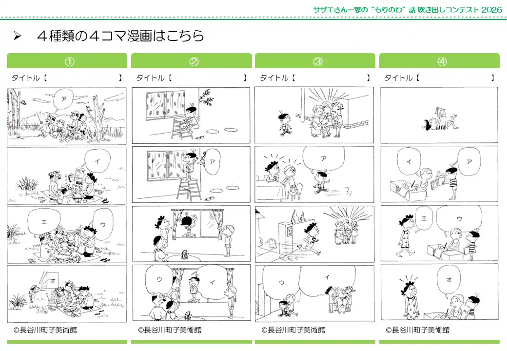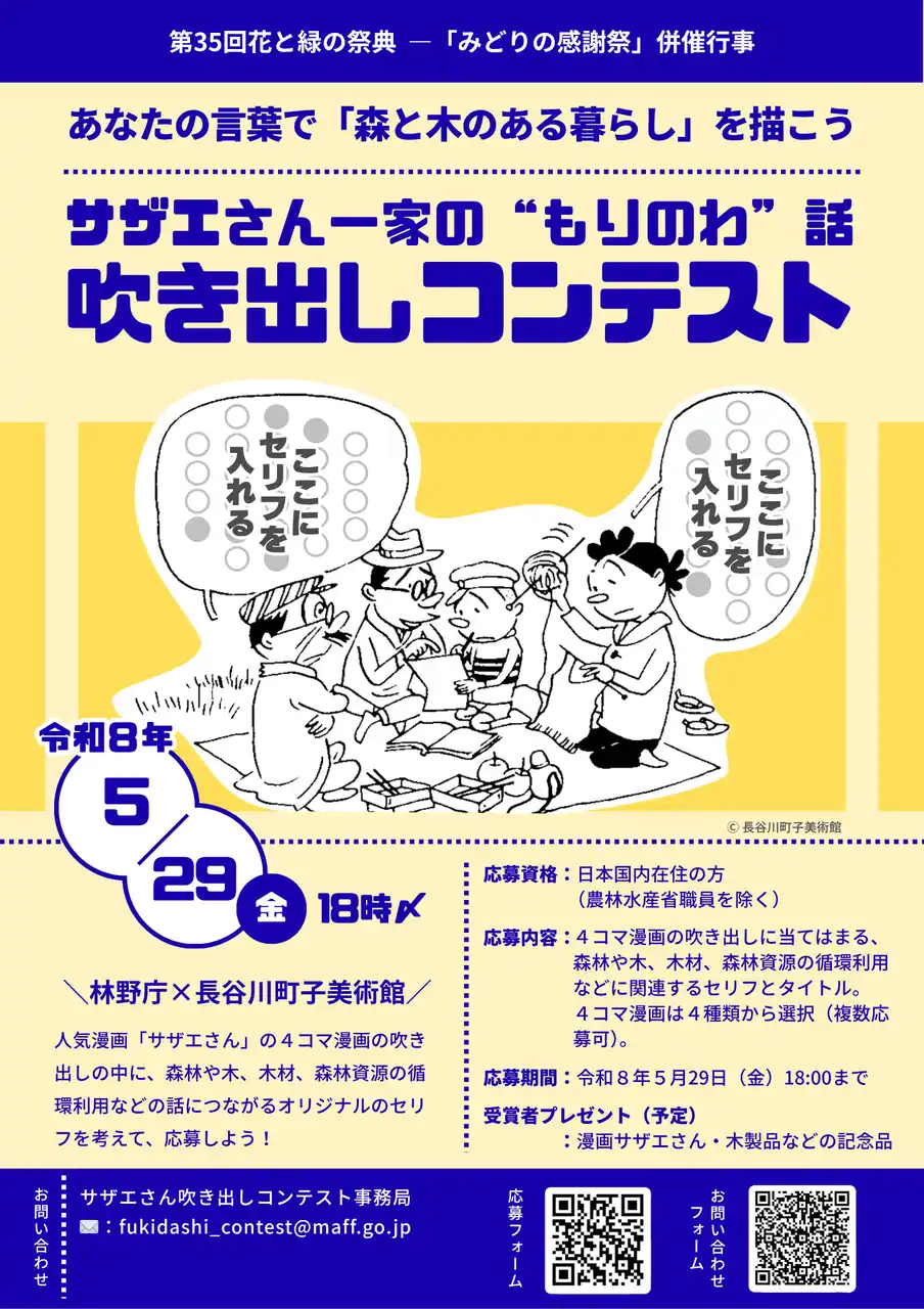 | 林野庁は、森林資源の循環利用について国民の皆さんに考えていただくため、「サザエさん一家の“もりのわ”話吹き出しコンテスト2026」を開催し、広く作品を募集します。 | |||||||