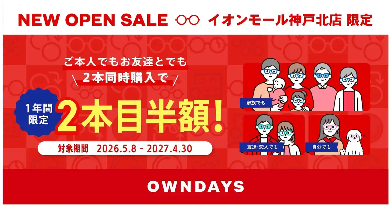 メガネ・サングラスの製造販売を手掛ける株式会社オンデーズ(本社:東京都品川区、代表取締役社長:海山丈司)は、2026年4月10日(金)、開業20周年を迎える兵庫県神戸市北区のイオンモール神戸北に「OWNDAYS イオンモール神戸北店」をオープンいたします。