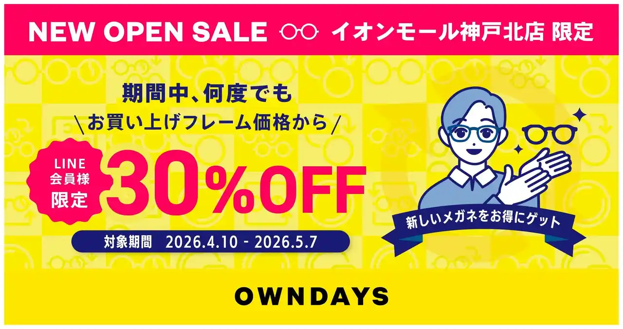| 2026年4月10日(金)から5月7日(木)までの期間中、「OWNDAYS イオンモール神戸北店」をご利用いただくお客様を対象に、6,000円(税込)以上フレームが表示価格から30%OFFとなる「NEW OPEN SALE」を実施いたします(※2)。本キャンペーンは、OWNDAYS公式LINEアカウントへのご登録を条件に、期間中、何度でもご利用いただけるお得な内容となっています。この機会にぜひご利用下さい。この機会にぜひご来店いただき、春の新生活に向けたアイウェア選びをお楽しみください。 | |||||||||