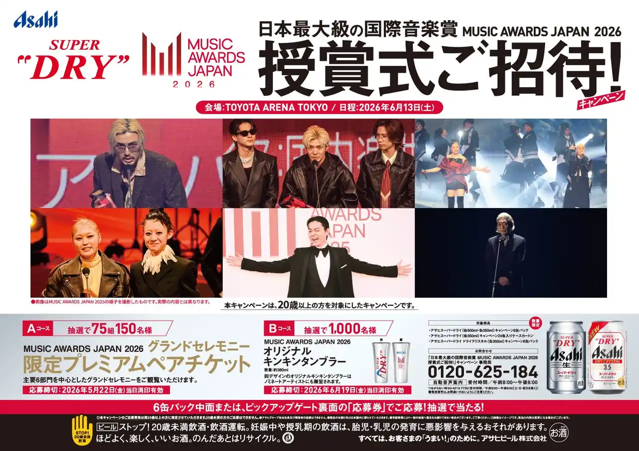 4月21日からは「MUSIC AWARDS JAPAN 2026」授賞式に参加できるチケットなどが当たるキャンペーンを実施します。同日から発売する対象のキャンペーンパックを購入して応募すると抽選で、グランドセレモニーの限定プレミアムペアチケットが75組150名に、また「MUSIC AWARDS JAPAN 2026」ロゴ入りのオリジナルキンキンタンブラーが1,000名に当たります。 |