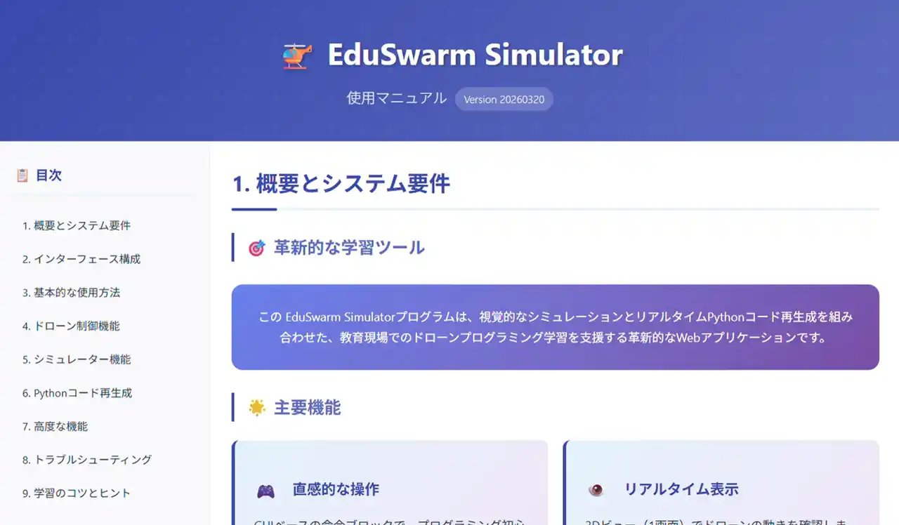 | 本サービスは、複数のドローンの動きをブロックで設計し、シミュレーターで確認し、その内容をPythonコードとして実機へつなげる一連の流れを、学校現場で扱いやすい形にまとめたものです。 | |||