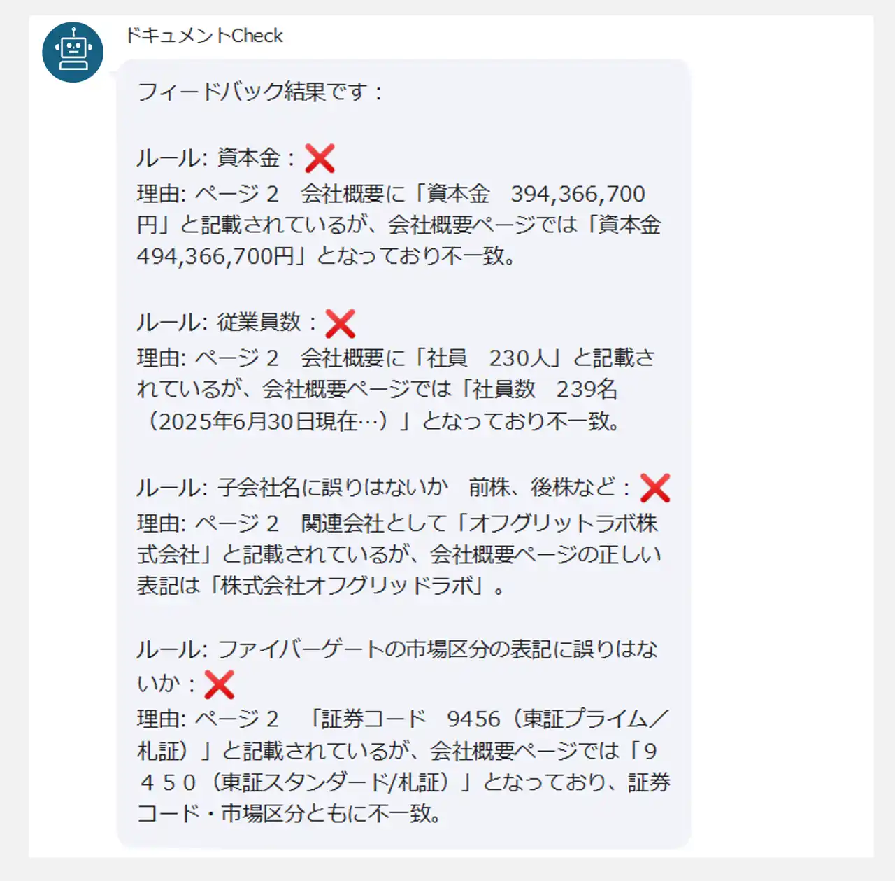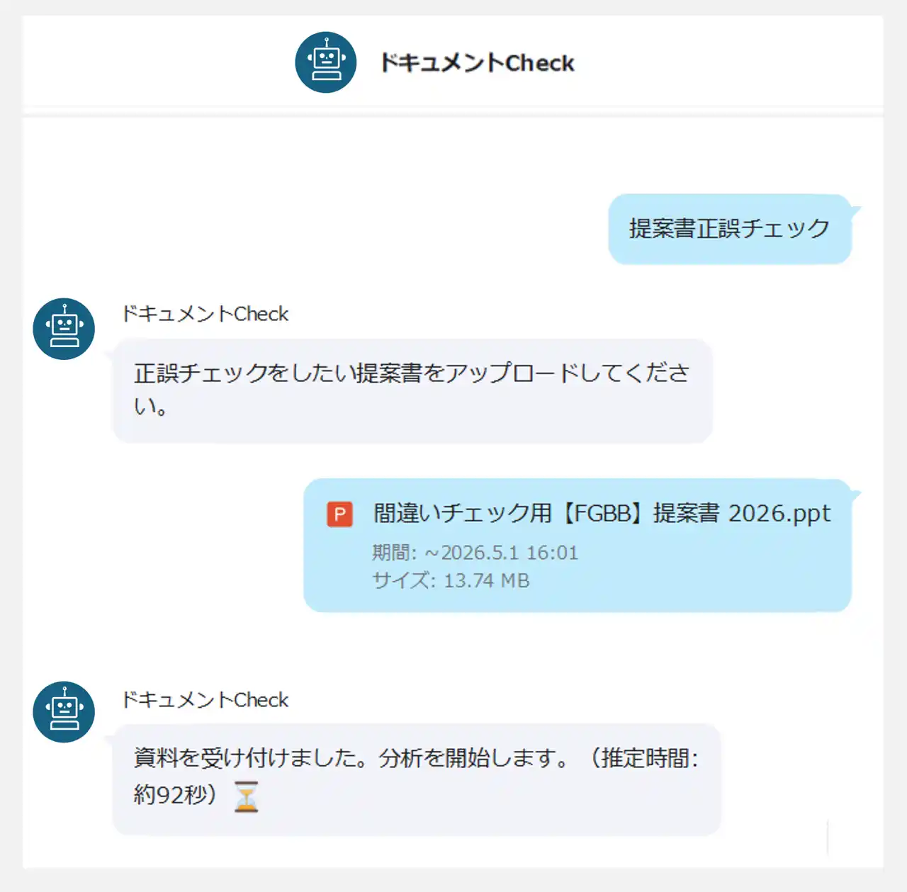 資料を送信後、分析が完了次第トークルームに結果が自動で返信されます。手軽な自己レビューとして活用でき、人の目による最終チェック前の段階で資料の質を高めることで、業務効率の大幅な向上に貢献します。 |