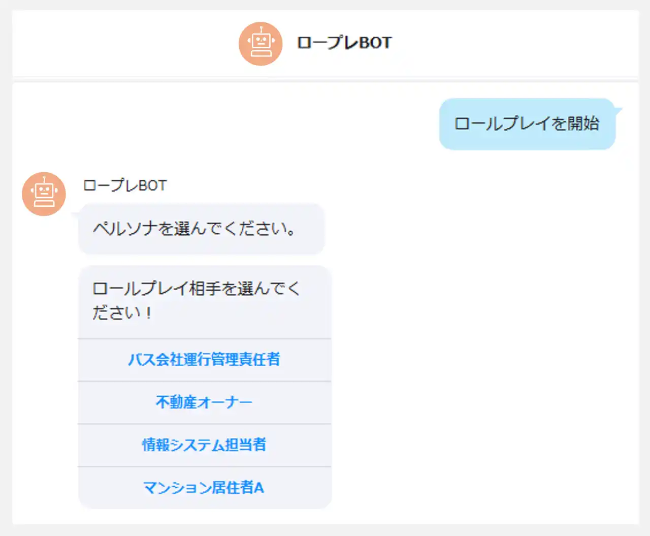 普段利用している社内チャットツールでBotをチャットルームに追加し、メニューから「ロールプレイを開始」を選ぶだけで簡単に利用可能です。 |