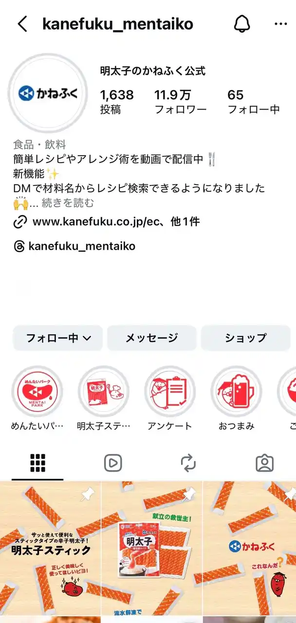 また、TVCMやSNSにも力を入れており、公式Instagramでは約12万人のフォロワーに向けて、明太子の魅力やレシピを発信しています。 |