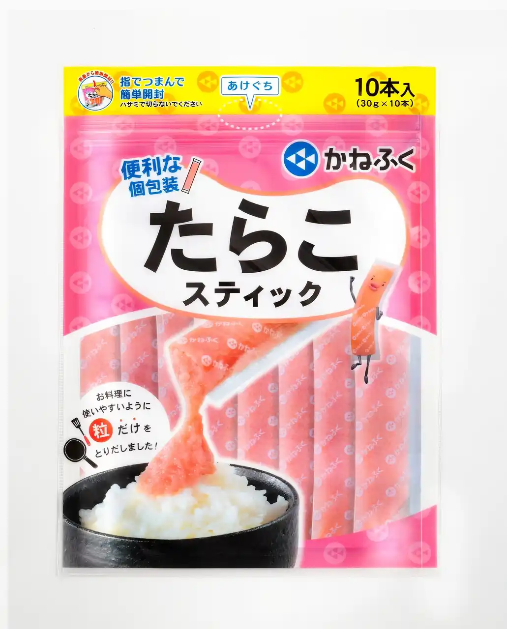 「明太子スティック」は、皮を取り除き粒だけにした明太子で、そのままでも料理でも使える便利な商品です。定量包装・冷凍保存が可能で、「簡単・便利・衛生的」として人気があります。 |