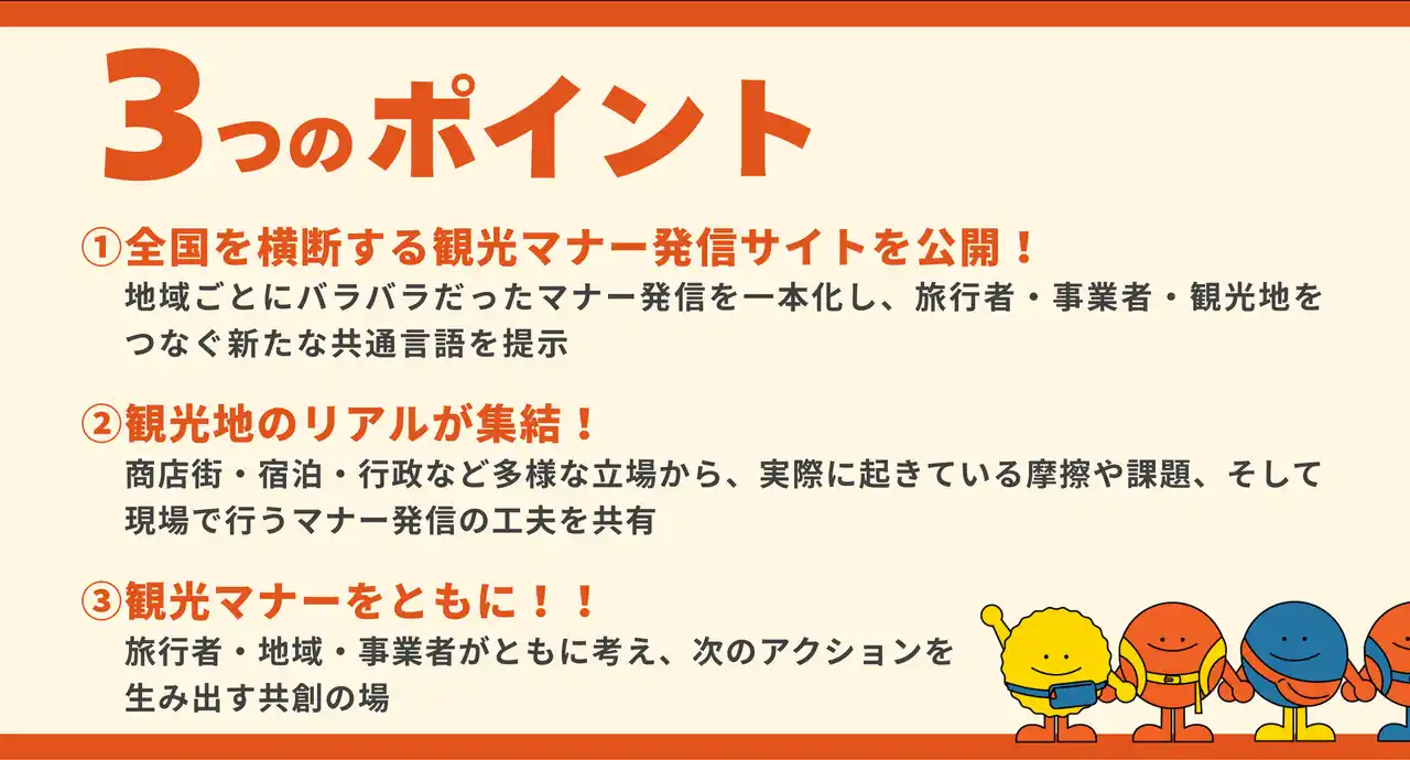訪日4000万人時代、オーバーツーリズムを未然防止するための「観光マナー発信」は、各事業者が個別に行うものから、連携して取り組む段階へと移行しています。また、一部の主体だけが担うものではなく、すべての観光関係者がジブンゴトとして取り組むべき共通のテーマです。本サミットでは、その具体的なあり方と実践のヒントを提示します。ぜひ会場またはオンラインでご参加ください。 |
