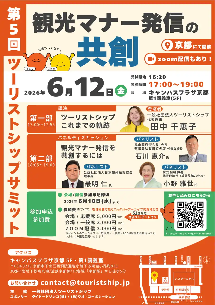 一般社団法人ツーリストシップ(本社:京都府京都市)とツーリストシップグローバル株式会社(本社:東京都渋谷区)は、2026年6月12日(金)17時より、キャンパスプラザ京都(京都府京都市)にて「第5回ツーリストシップサミット~観光マナー発信の共創~」を開催します。本サミットは、ツーリストシップとその取り組みを広く発信することを目的に毎年開催しているもので、第5回となる今回は「観光マナー発信の共創」をテーマに実施します。現場で起きている課題や摩擦、そして発信の工夫を共有し、より良い観光環境を共につくるための具体的なヒントと連携の可能性を提示します。 |