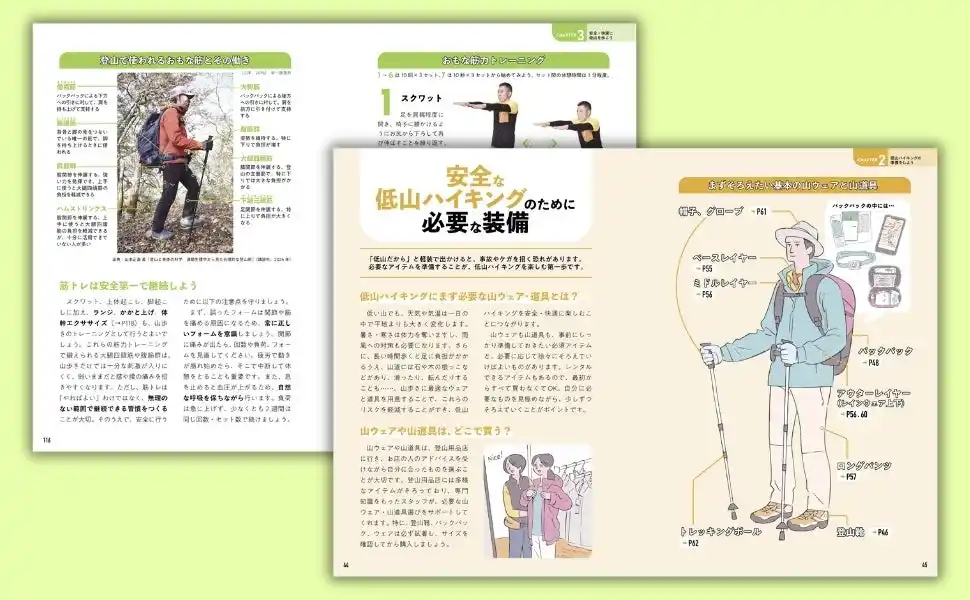 さらに、自分に合った日常のトレーニングやストレッチ法も収録。安全・快適なハイキングをサポートします。 |