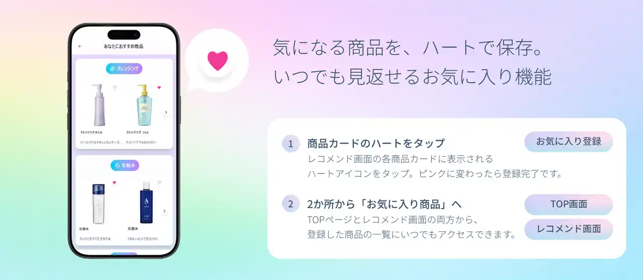 これまではレコメンド商品をあとから見返す手段がありませんでしたが、本機能により気になった商品を「お気に入り商品」として残せるようになりました。登録したアイテムはTOPページおよびレコメンド画面からいつでも確認できます。これにより、「お店に行ったときに確認したい」「今のアイテムが無くなったら切り替えたい」など、購入検討を自分のペースで進める使い方が可能になります。 |