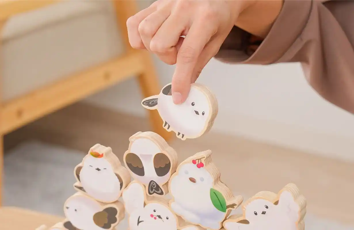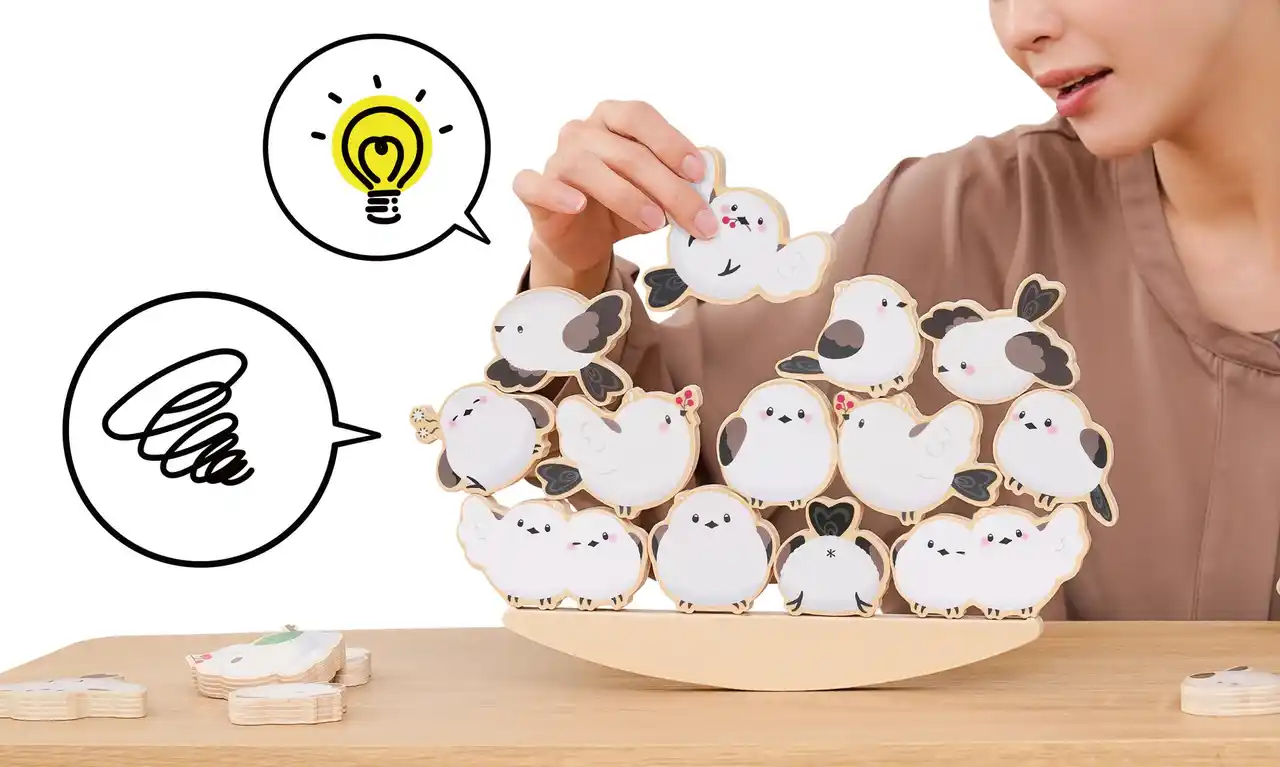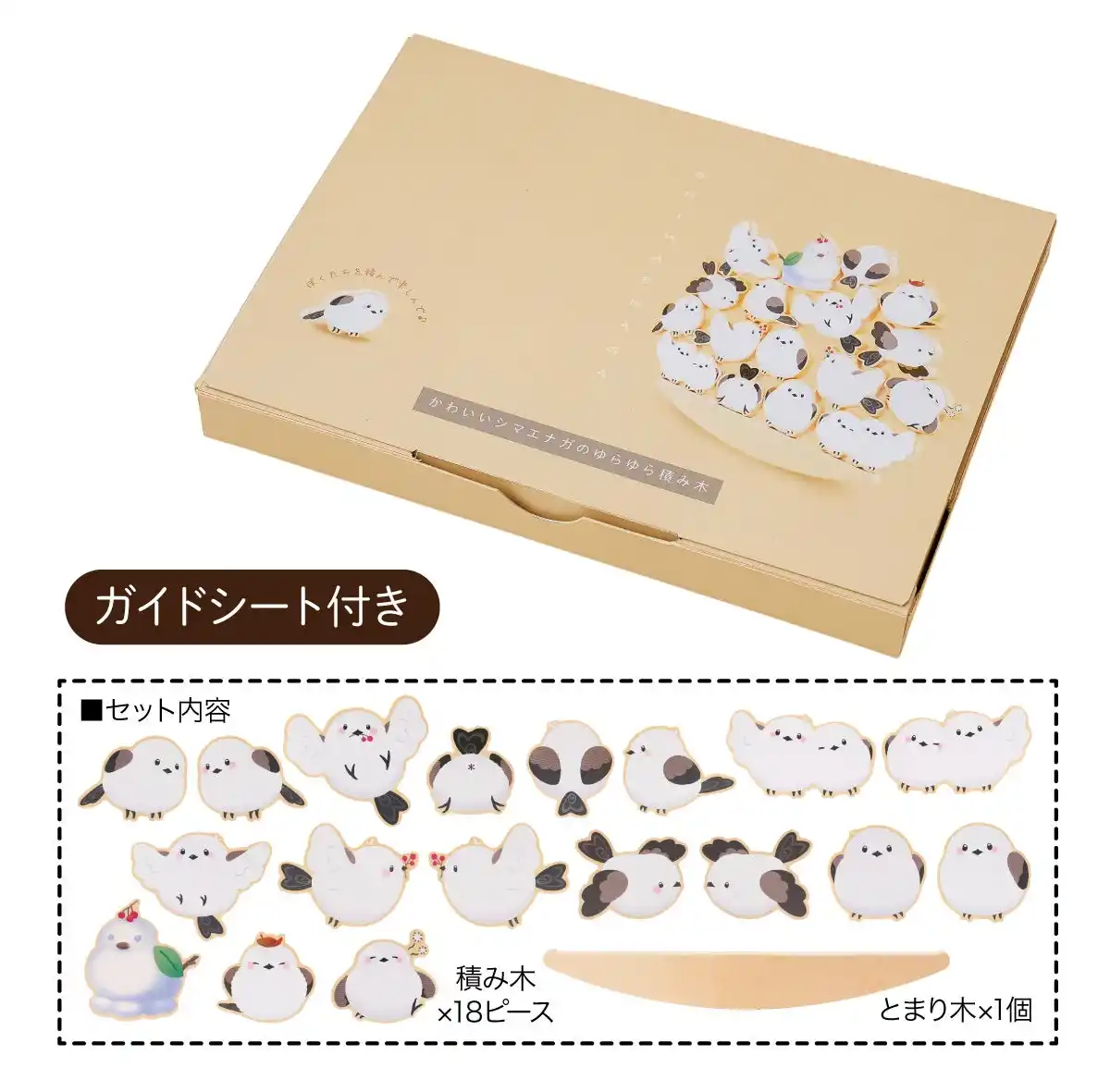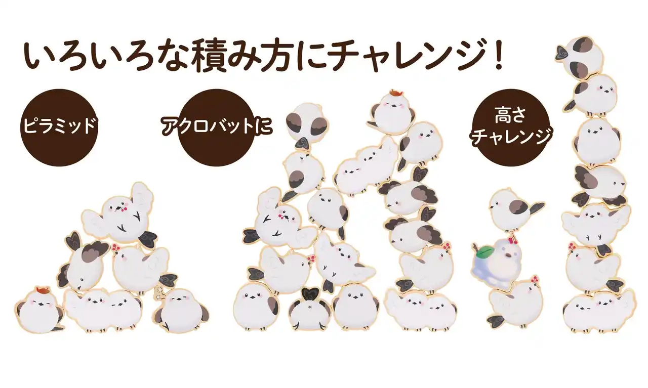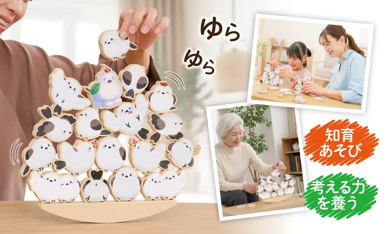 20羽(18ピース)の形が違うシマエナガたちは「並べるだけで癒される存在」。ゆらゆら揺れるとまり木に積み上げたり、組み合わせたりすることで、遊びながら自然と集中力と思考力のトレーニングができます。 |