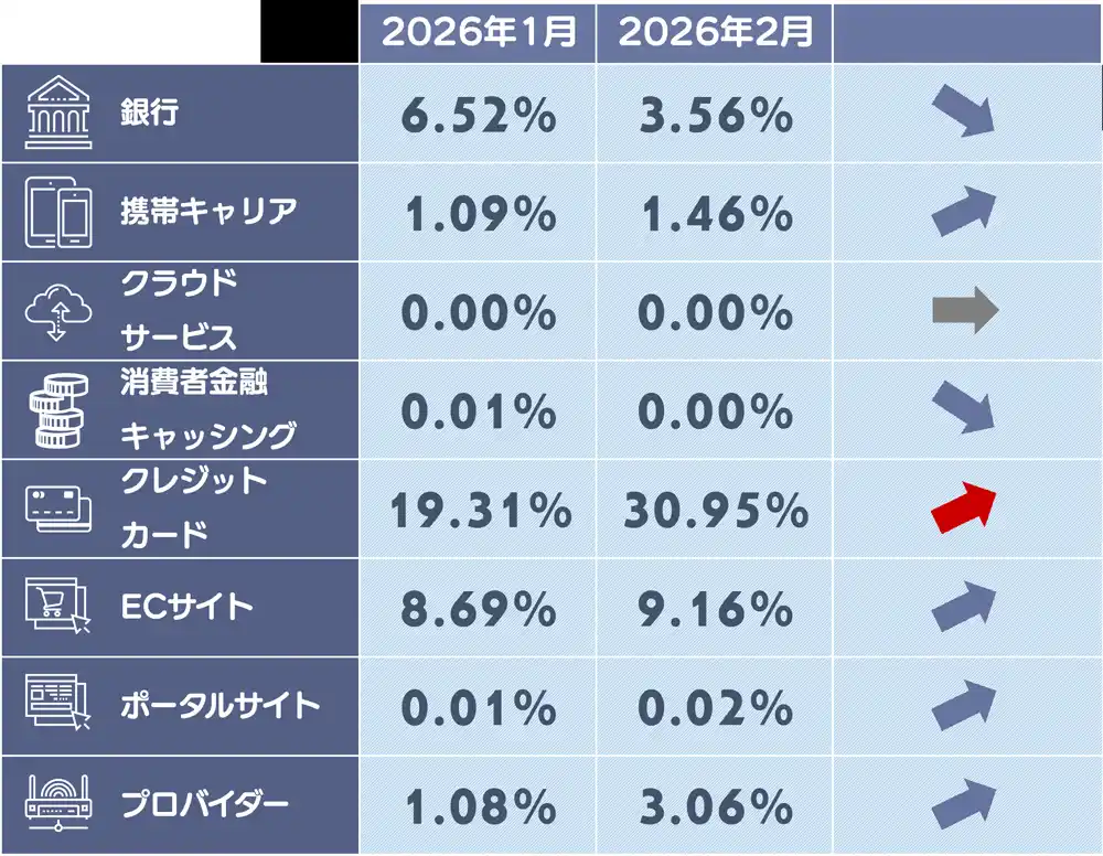 2月度は、クレジットカードを装ったフィッシングサイトの構成比が上昇しています。ただし、毎年この時期はフィッシングサイト全体の収集数が減少する傾向があり、実数ベースではすべてのカテゴリで減少しています。 |