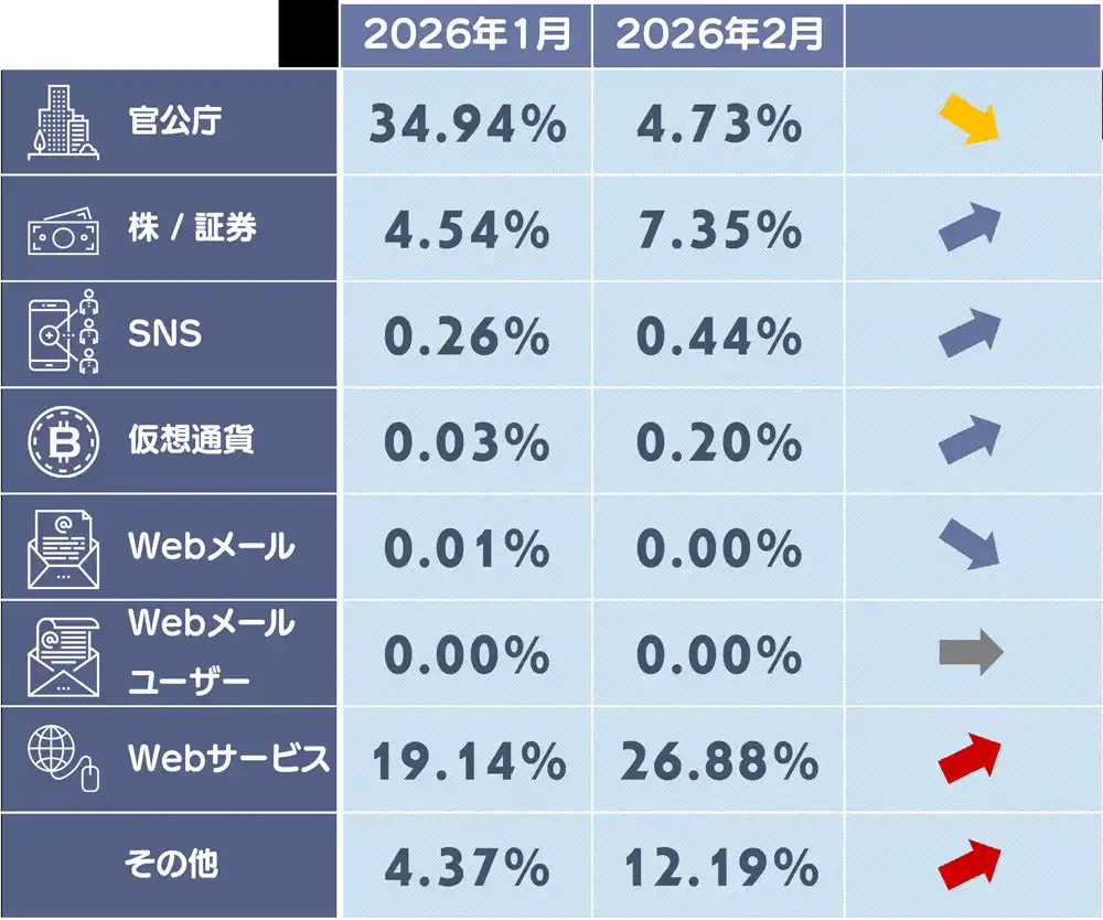 また、1月度に1位であった国税庁を装うフィッシングサイトが大幅に減少しました。10月度から4か月連続で増加を続けてきた国税庁フィッシングですが、確定申告シーズンの山場を過ぎたことで攻撃者が撤退したものと見られ、攻撃キャンペーンの「始まりと終わり」が明確に可視化された事例と言えます。