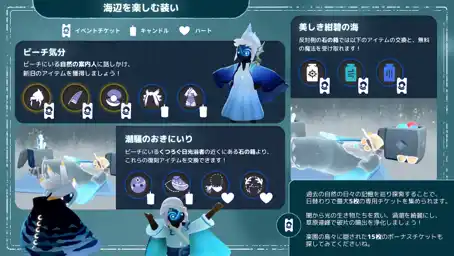 イベント専用通貨「イベントチケット」は、各種アクティビティへの参加で1日最大5枚まで獲得できるほか、楽園の島々のエリア内には一度限り入手可能な15枚のボーナスチケットが隠されています。集めたチケットは、イベント限定のコスメティックアイテムと交換できます。 |